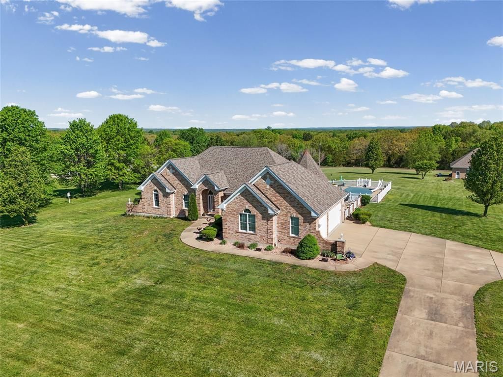ALL BRICK ATRIUM RANCH on ACREAGE!!! This stunning Brick ranch in Festus, located in the sought-after Victoria Xing subdivision, sits on 4 acres and a spacious corner lot, offering exceptional features throughout, including a 3-car attached garage and a large detached 8-car garage. Inside, you'll find original wood trim, stunning hardwood floors, abundant natural lighting from the great room atrium , an intercom system, plus a central vac. THREE Fireplaces! You will fall in love with the luxurious kitchen featuring a unique gazebo ceiling, cozy breakfast nook, and separate dining area perfect for entertaining. Spacious primary suite with a walk-in closet, amazing see-through fireplace facing the jetted bathtub sheeted in beautiful tile, a double vanity, and two person shower. The main floor also features convenient laundry with half bath. The finished lower level expands your living space with a large recreation room, wet bar, a bedroom with full bath, three additional versatile rooms, and ample storage. You'll also find a super high efficiency Water Furnace (geo-thermal) just installed a couple of years ago with the balance of a 10 year warranty. High efficiency 88 gallon water heater too! The electric bills are way less than you think!! Step outside to enjoy the numerous patios, in-ground salt pool with new multi-speed pump, and peaceful surroundings perfect for relaxing or hosting gatherings. And for your Car Collection, the all brick, fully insulated, detached garage (room for 8 cars!) comes complete with heating & cooling, a wash bay with drain, water connection, and intercom connectivity. The garage is every guys dream! The acreage lays beautifully and the yard will take your breath away. Everyone in the subdivision takes great pride in their homes which ensures your investment is safe. No disappointments here!