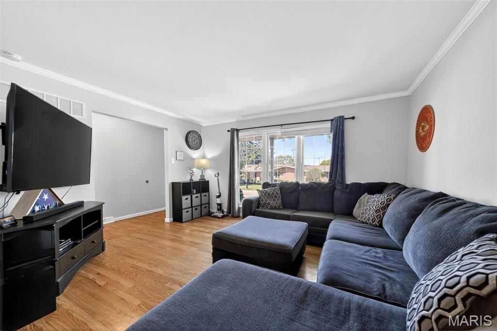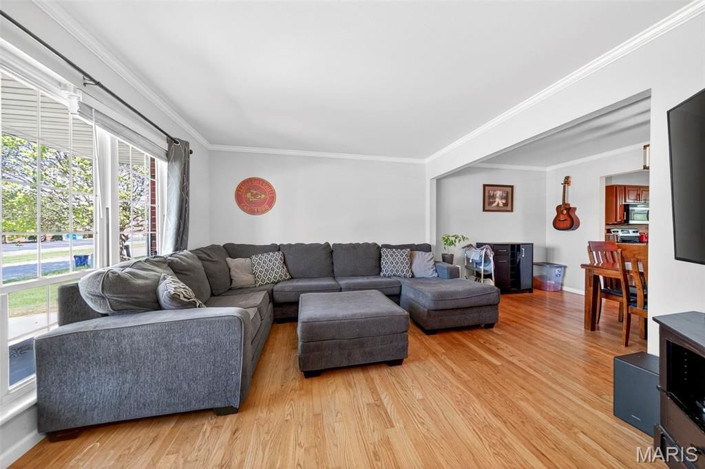 Welcome to this beautifully updated ranch nestled on a peaceful, tree-lined street in Florissant. Offering 3 bedrooms and 2 full bathrooms on the main level, this home combines comfort, style, and space in all the right ways.Step inside to find gorgeous natural wood flooring flowing throughout the main living areas and bedrooms, complemented by a spacious living room with vaulted ceilings that creates an open, airy feel. The main level also features a formal dining area and a versatile bonus space perfect for a home office, playroom, or additional lounge.The kitchen is designed to impress with granite countertops, stainless steel appliances, a sleek modern backsplash, and quality wood cabinetry. Both bathrooms have been thoughtfully updated, featuring stylish tile finishes, one with a walk-in shower and the other with a tiled tub.Downstairs, the expansive finished basement offers incredible flexibility with a massive living area and an additional oversized bonus room, making it ideal for extended living, entertaining, or guest space.Outside, enjoy a fully fenced backyard with a concrete patio that is perfect for relaxing or hosting gatherings. The attached garage provides ample storage, adding even more convenience.Conveniently located near Cross Keys Shopping Center, you will have quick access to shopping, dining, and everyday essentials while still enjoying a quiet residential setting.