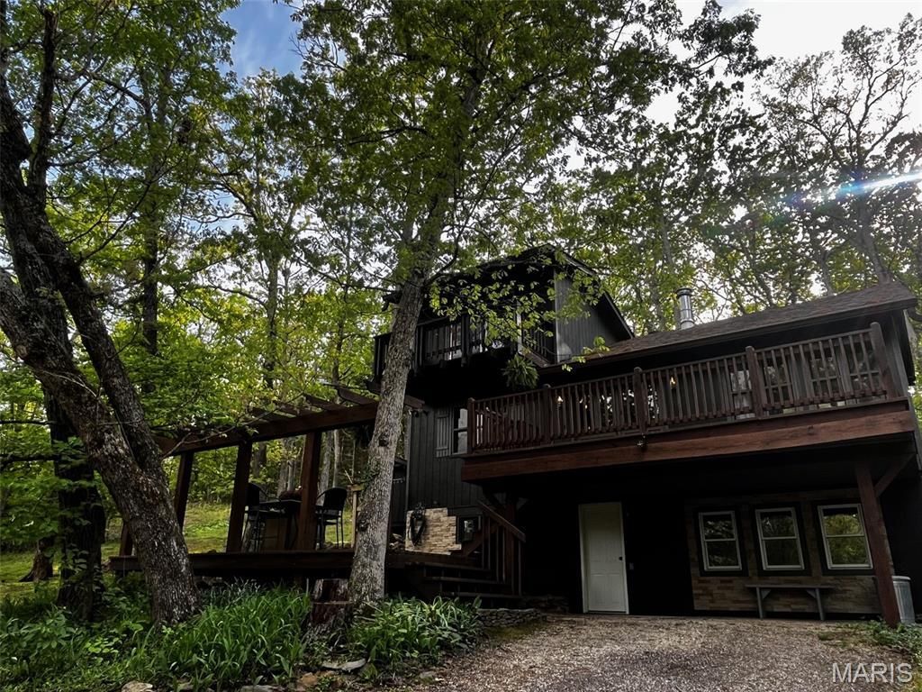 Tucked among the trees with a view of a stunning 175 acre lake, this one of a kind, multi-level home feels like your own modern treehouse. Three separate decks create effortless indoor/outdoor living-perfect for morning coffee above the treetops or evenings spent entertaining friends. Inside, you'll find three bedrooms, a beautifully renovated full bath on the main level, and a convenient bath on the lower level. A cozy wood stove anchors the living space, and large windows frame the surrounding greenery, filling the home with natural light. Just a short stroll from the beach area, you'll have easy access to drop in your kayak or paddleboard. Pretty landscaping wraps the property, enhancing the serene, quiet setting. The community offers fantastic lake amenities including a clubhouse, pool, fishing, boating, camping, and a sandy beach for relaxing summer days. Whether you're looking for the perfect weekend escape or full-time lake living, this home delivers a peaceful getaway with all the comforts you need.