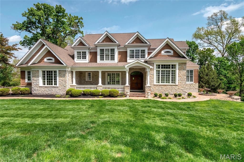 Welcome to 18105 Dawns Trail. Stunning Flower Homes 1.5 story build located in sought after Three Sisters Farm subdivision in Wildwood. Nestled on over 3 acres, this 5 bed, 4.5 bath residence impresses with stately exterior curb appeal, stone facade, bespoke wood dual entry door and an expansive covered porch. A grand foyer welcomes you inside with 10 foot ceilings and rich hardwood floors throughout, flanked by the formal dining room featuring crown molding, custom shutters and archway details, as well as the distinguished study with 12 foot ceilings, sliding wood doors and wood burning fireplace. The formal living room boasts a box bow window, statement wall and recessed lighting. The open concept, renovated kitchen includes an impressive center island with seating for six, stone counters, designer cabinetry, high end SS appliances, double wall ovens, ice maker and a built in refrigerator and flows into the two story hearth room featuring a window wall with views of nature and sculptured built ins framing the stone, gas fireplace. The owners suite showcases coffered ceilings, dual walk-in closets and a luxe bath with soaking tub, dual sinks and tiled shower. A spacious mud room with laundry sink and formal powder room complete the main level. The upper level showcases a bonus loft area, 3 guest bedrooms, each with a walk-in closet, serviced by 2 full baths. The light filled walkout lower level features a substantial recreation space and family room with a full wet bar, as well as a library, dedicated media room, additional guest bedroom, full bath, bonus space and ample storage.. Step outside onto the covered, screened deck area and enjoy the outdoor fireplace, or entertain guests on the connecting open deck area. Below you find a stamped concrete patio with a built in stone fire pit overlooking the private, tree lined backyard. Enjoy the surroundings while sitting at the side courtyard terrace with stone planters. Additional features include a 3 car side entry oversized garage, full irrigation, convenient access to amenities and highways located in award winning Rockwood School District boundaries. Extensive Features and Inclusions List available.