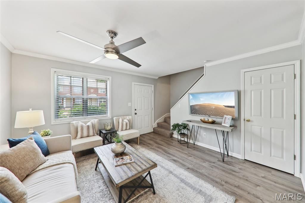 Welcome Home to 8854 Flamingo Court - Sophisticated Living in the Heart of Brentwood Forest - This impeccably updated townhome offers a rare fusion of timeless charm and modern convenience. Step into a light-filled living room where rich crown molding & newer flooring create a warm, sophisticated ambiance. The adjoining dining room is framed by oversized sliding glass doors, opening to a private deck. The heart of the home is the designer kitchen, featuring gleaming quartz countertops, classic subway tile backsplash, custom cabinetry, & premium stainless steel appliances. Upstairs, the spacious primary suite offers double closets and peaceful repose, while the 2nd bedroom makes an ideal guest room or home office. A stylishly renovated full bath features a sleek new vanity and updated flooring, complemented by a convenient hallway laundry closet with washer and dryer included. Enjoy resort-style amenities: pools, tennis courts, scenic walking trails, & clubhouse, surrounded by beautifully landscaped grounds.The interior unit provides effortless access to the best of St. Louis. Walk to Whole Foods, First Watch, and easy access to Trader Joe's, Target, & the Galleria. Ample parking and meticulously maintained surroundings complete the picture of upscale suburban living. Whether you're seeking a stylish retreat or a sophisticated place to call home, welcome to the perfect blend of comfort, design, & location.